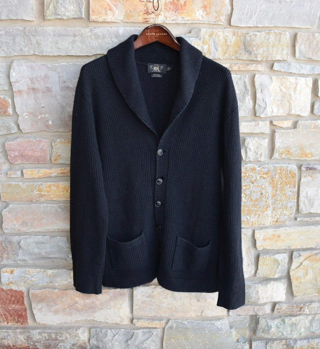 RRL Ralph Lauren Vintage Wool Cashmere Black Ribbed Shawl Cardigan Mens Medium M