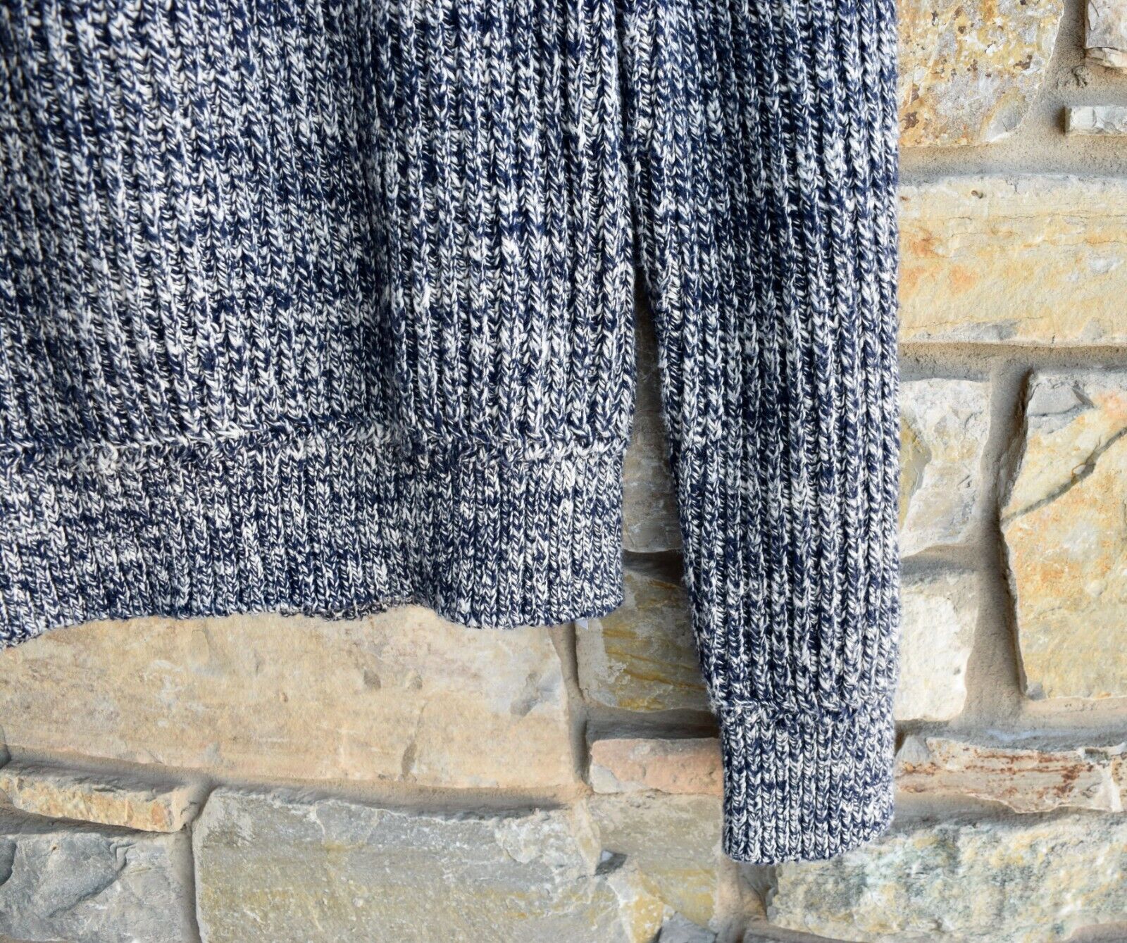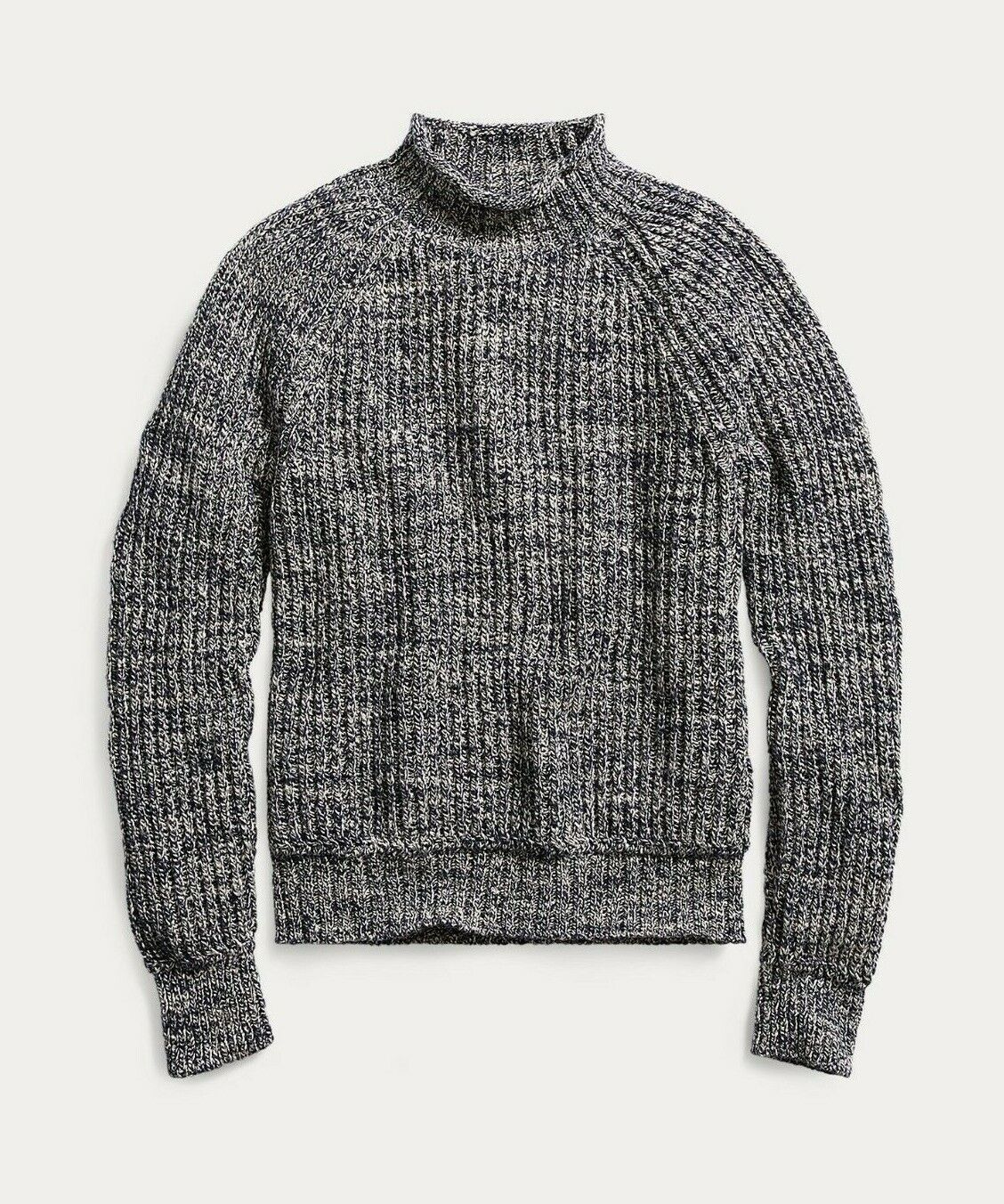 Chunky-knit mockneck sweater. Ragg yarn made from navy and cream ring-spun cotton.