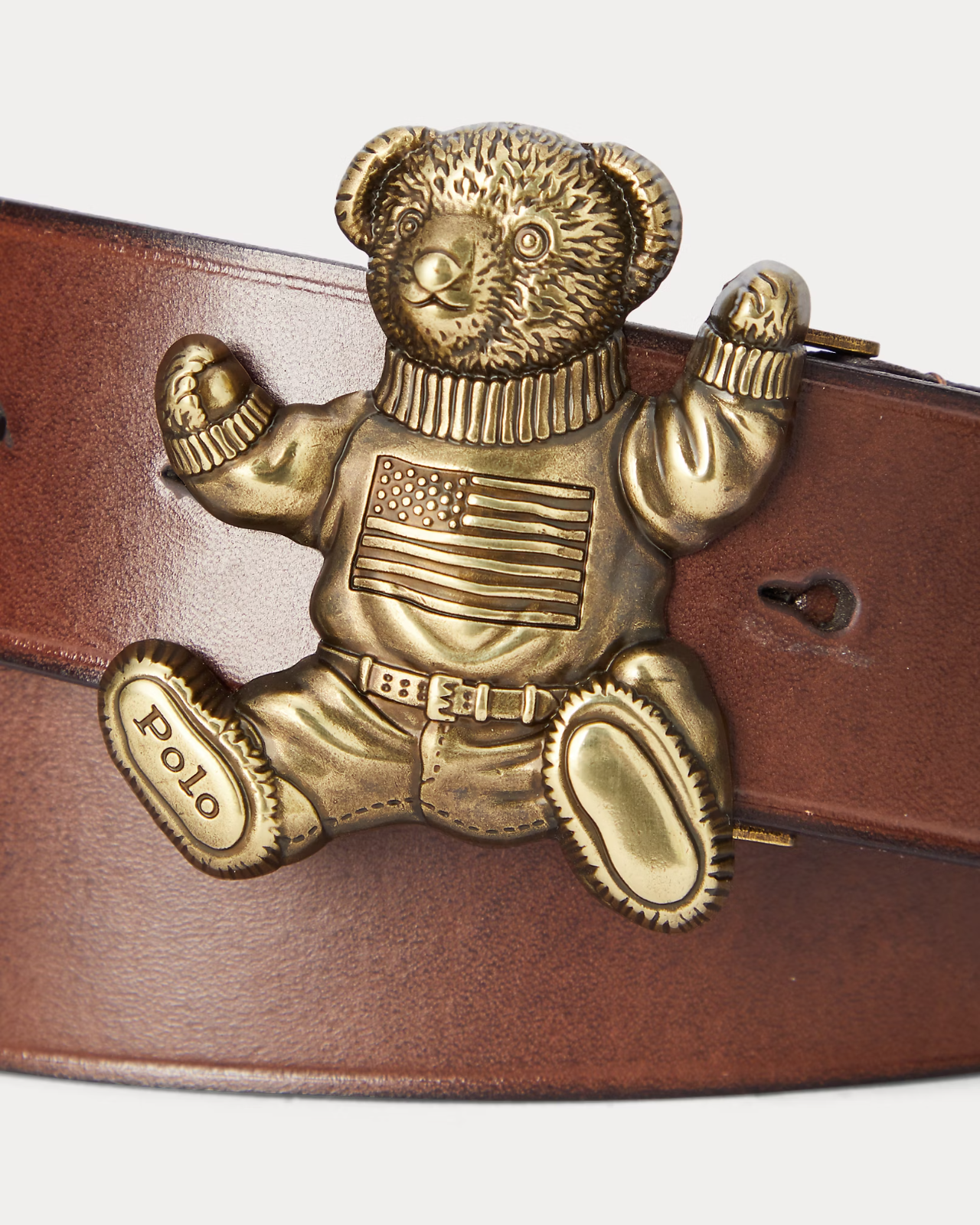 Ralph Lauren’s iconic Polo Bear, dressed in a flag-graphic sweater, adorns the buckle of this leather belt.