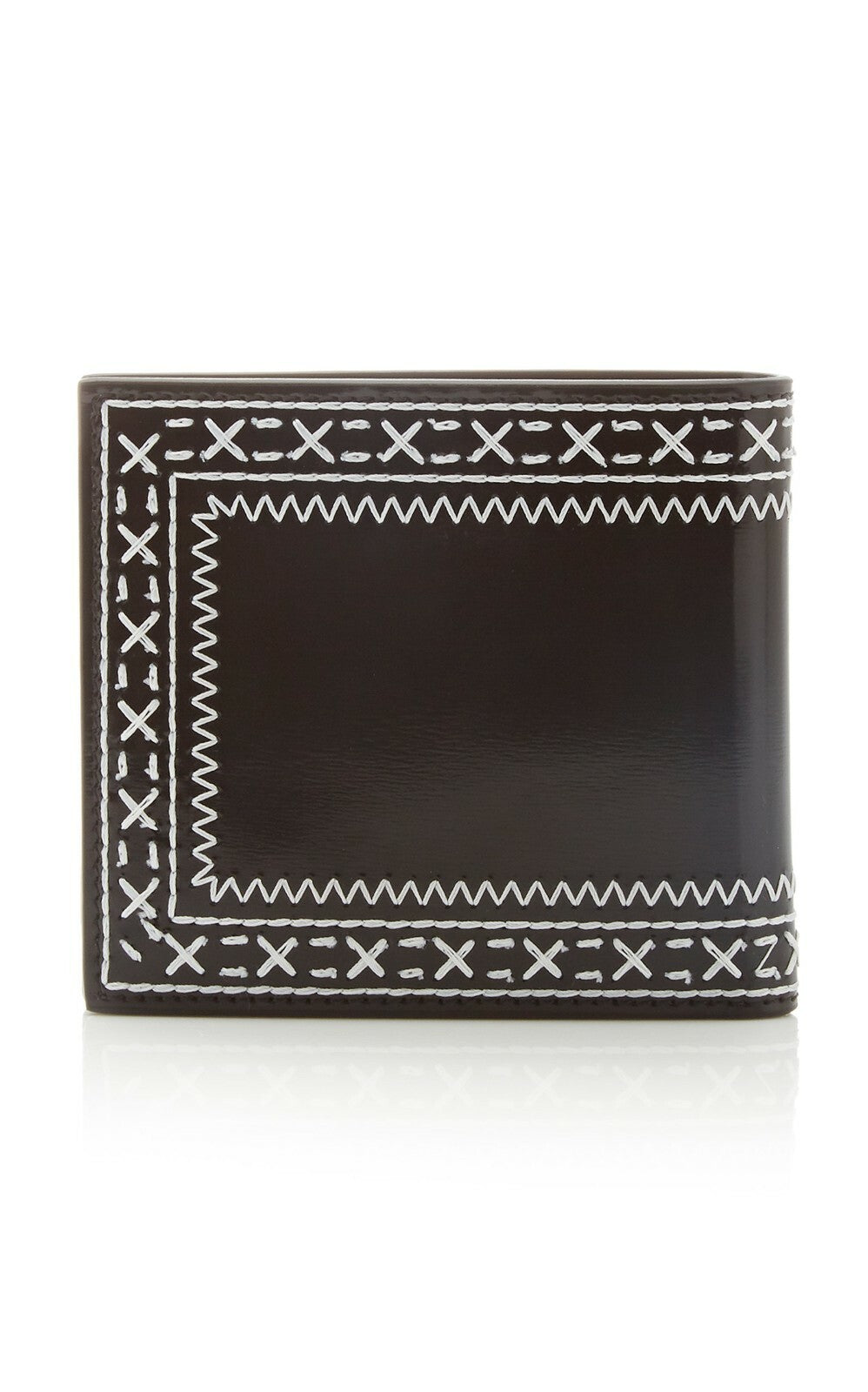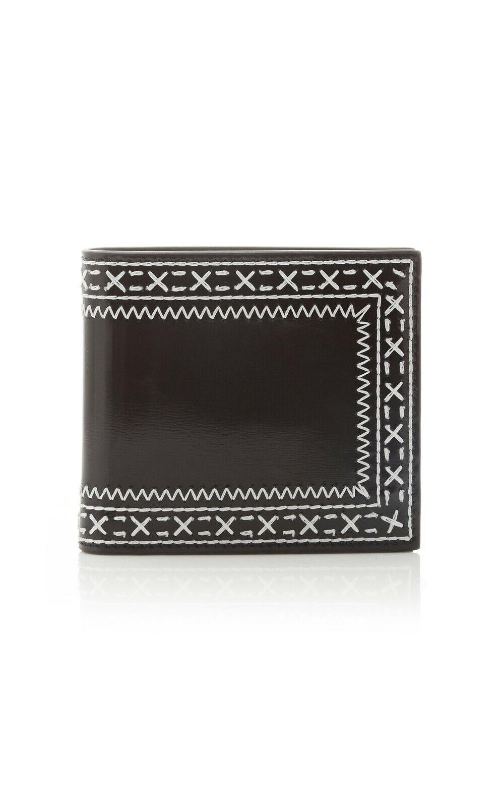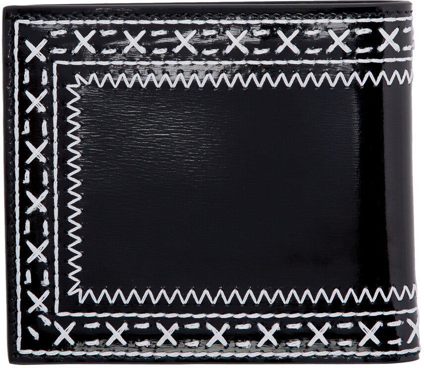 Thom Browne's wallet is crafted from glossy leather that's artfully embroidered with contrasting white threads. It opens to reveal the label's signature tricolor grosgrain flag with multiple slots for cash, credit cards and receipts.