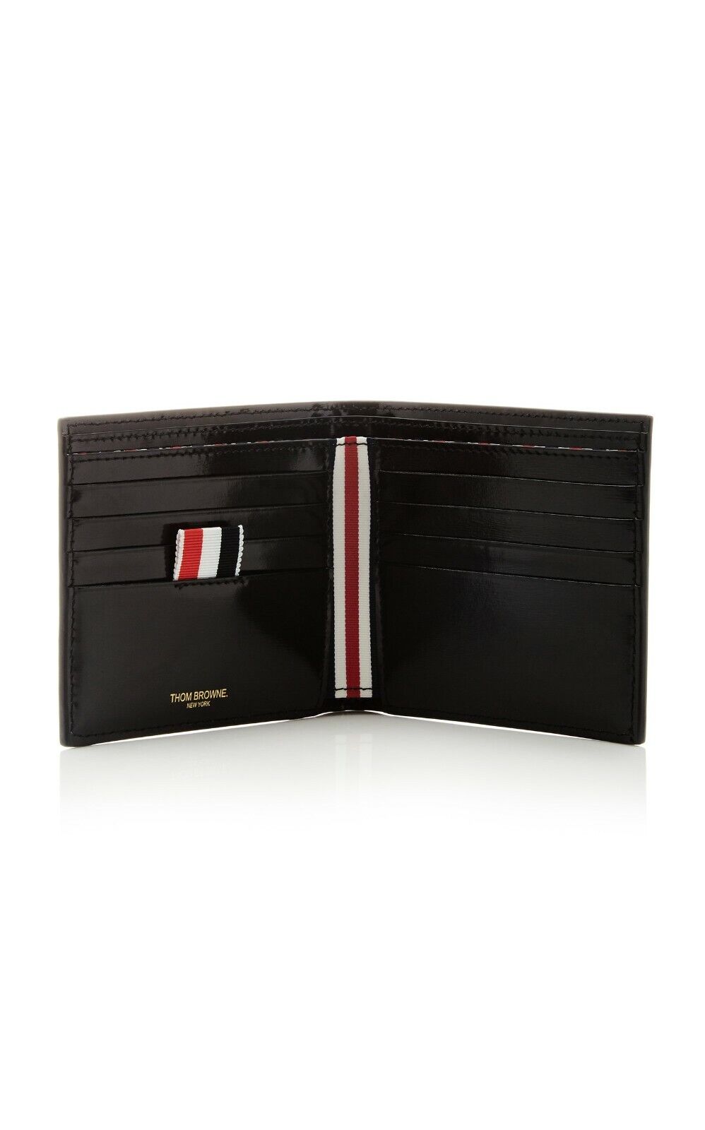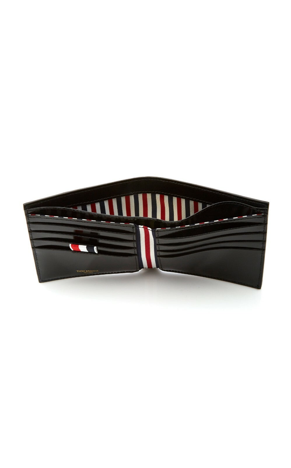 Patent calfskin bifold wallet in black. Tonal burnished edges and topstitching in white throughout. Gold-tone logo stamp, signature tricolor grosgrain flag, eight card slots, and four note slots at interior. Signature tricolor striped textile lining. Approx. 4.25" length x 4" height x 1" width.