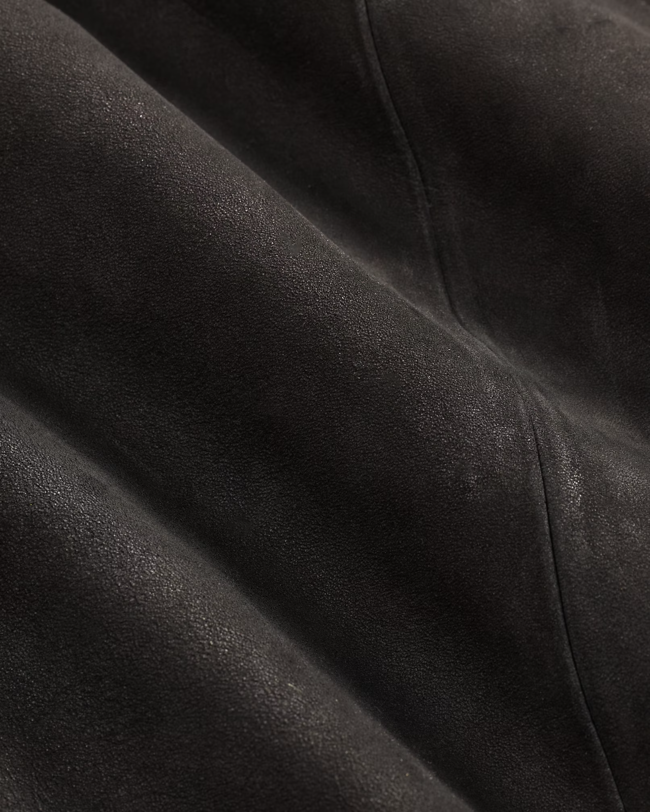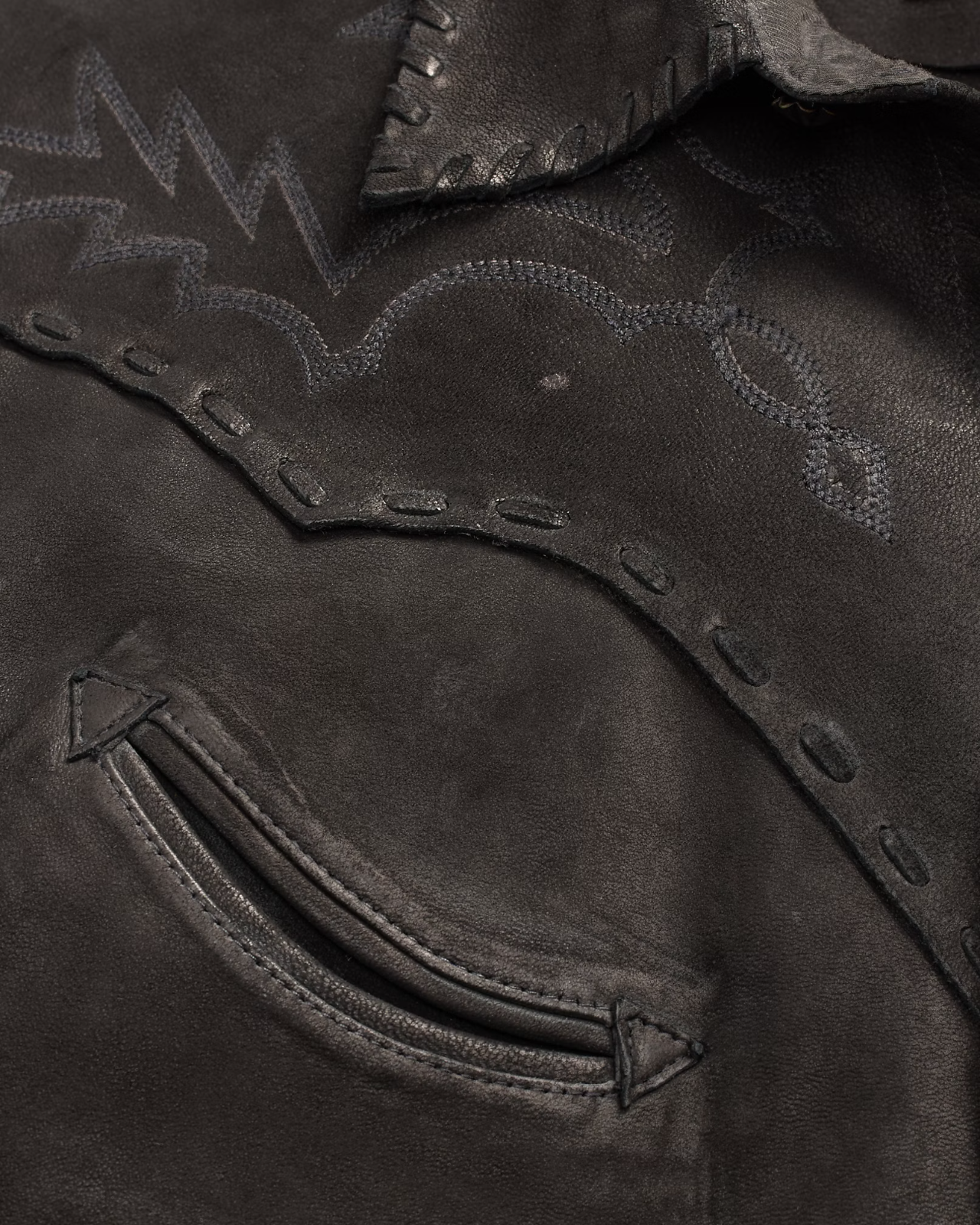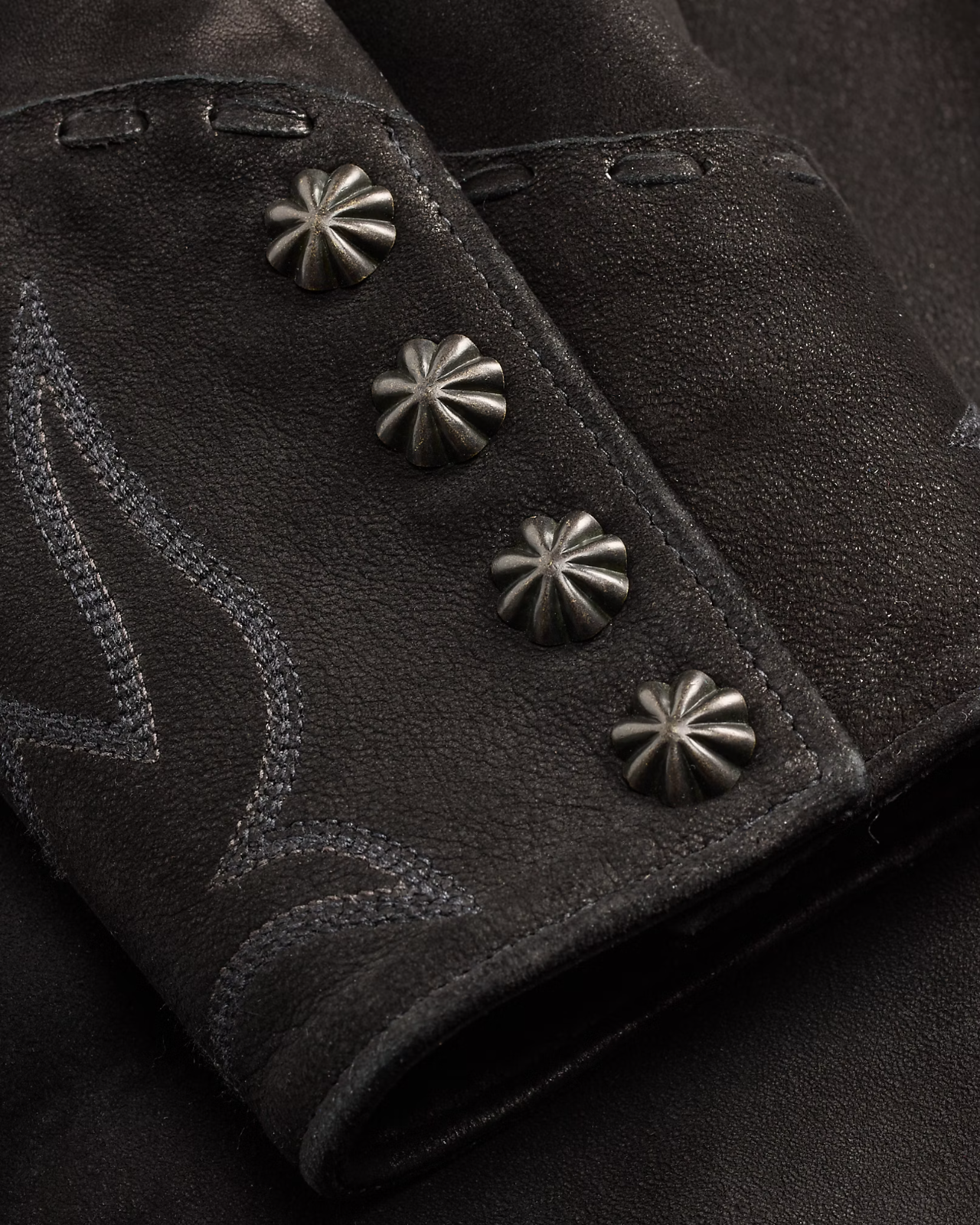 Made with lightweight sheepskin that is dyed and hand-waxed for a lived-in look. Western-style front and back yokes. Leather topstitching and tonal boot-stitch embroidery throughout. Metal button at the neck. Vintage-inspired snaps at the placket and cuffs.