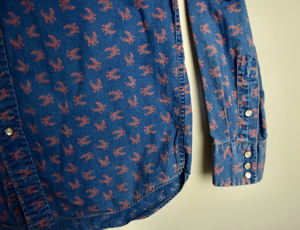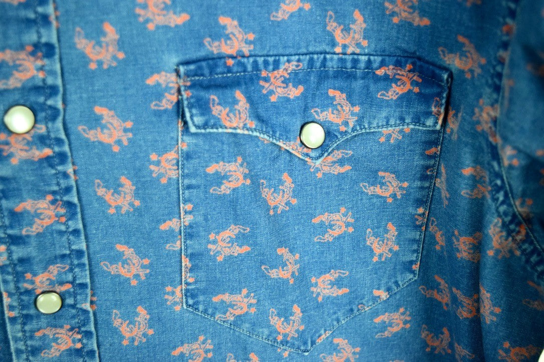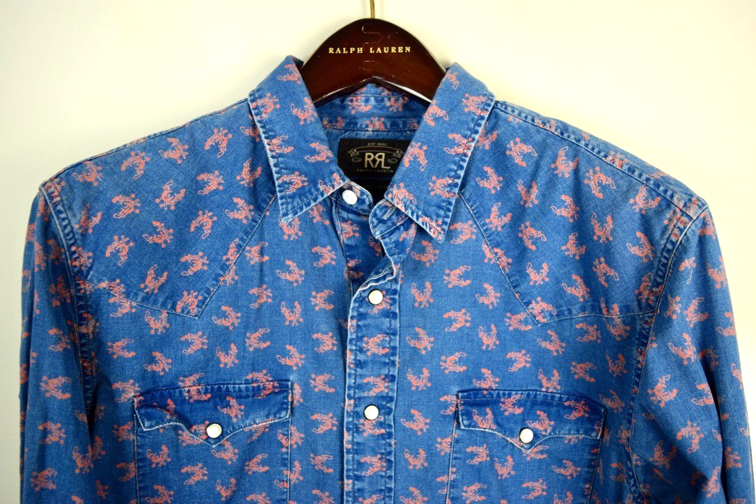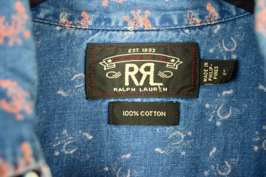 RRL Ralph Lauren Blue Slim Fit Tan Snap Print Western Shirt Size Men's Large L