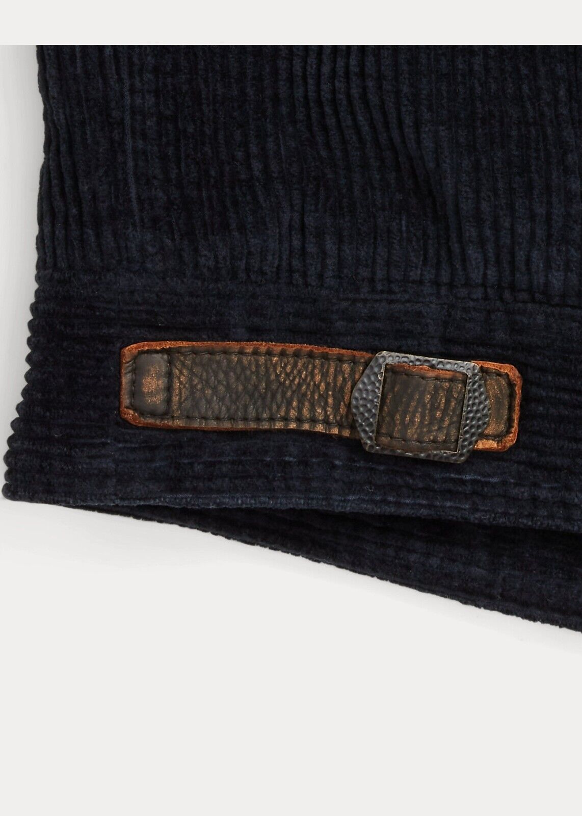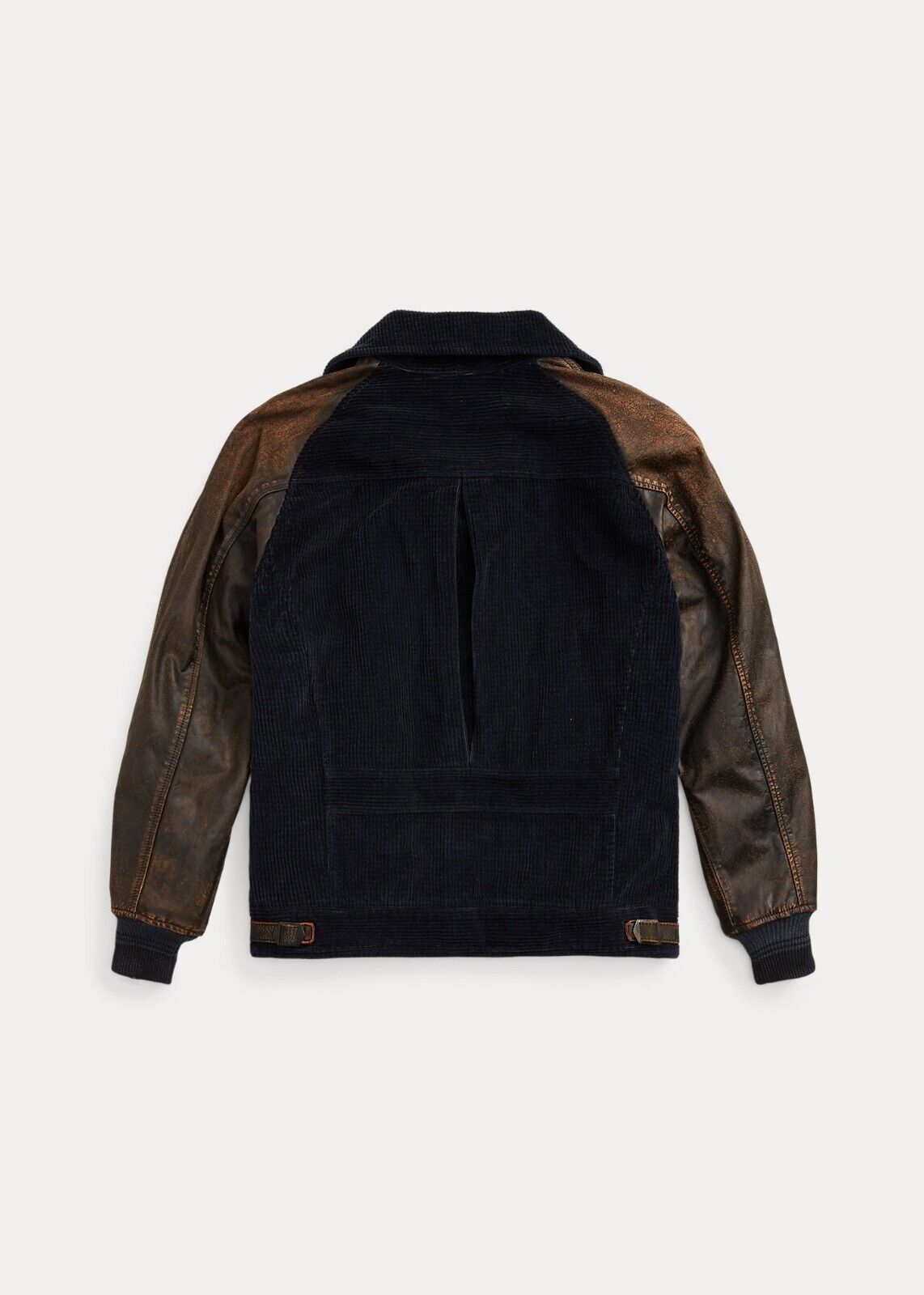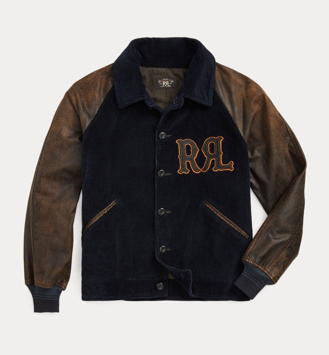 - Long leather sleeves with ribbed cuffs. Felt "RRL" patch appliquéd at the left chest. Two hand-warmer pockets with leather trim. Adjustable leather tabs at the sides. Fully lined.