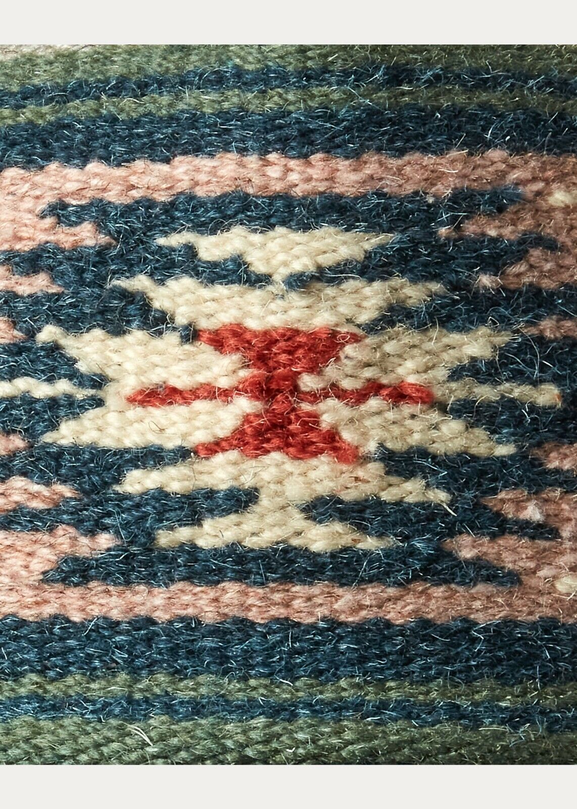 Front panel made from a wool blend handwoven with a motif inspired by Southwestern rugs. Mesh back panels. Indigo-dyed corduroy bill. Signature green underbill. Adjustable back strap.