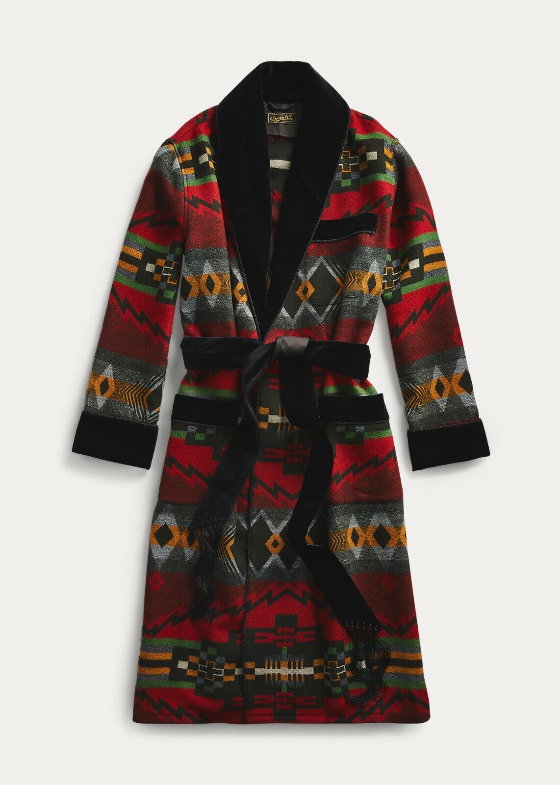 Made from a brushed cotton-and-wool jacquard. Pattern inspired by vintage blankets from the American Pacific Northwest. Italian velvet trim. Hand-knotted tassels at the belt.