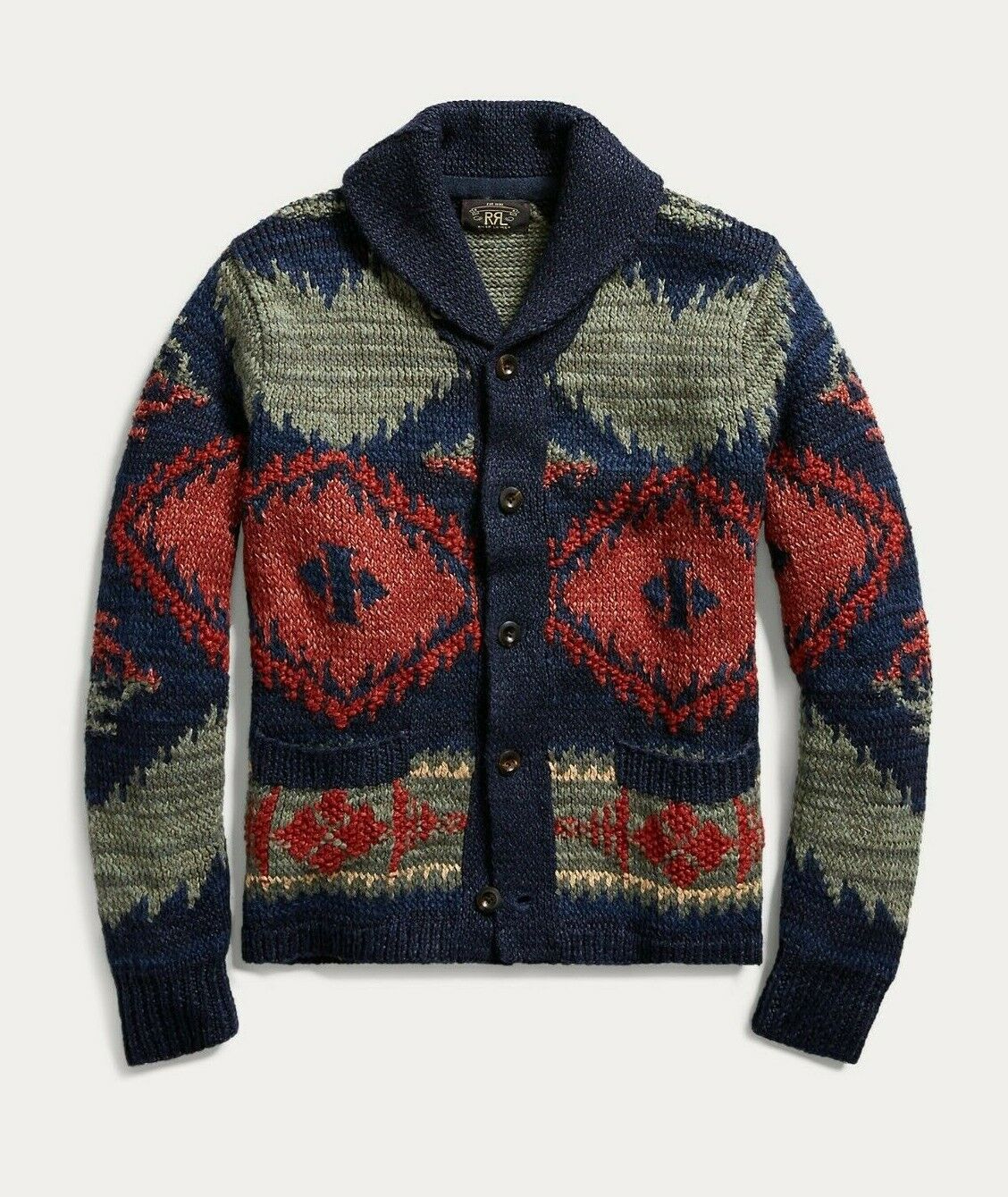 RRL Ralph Lauren Shawl Hand-Knit Geometric Cardigan Beacon Indigo Men's 2XL XXL
