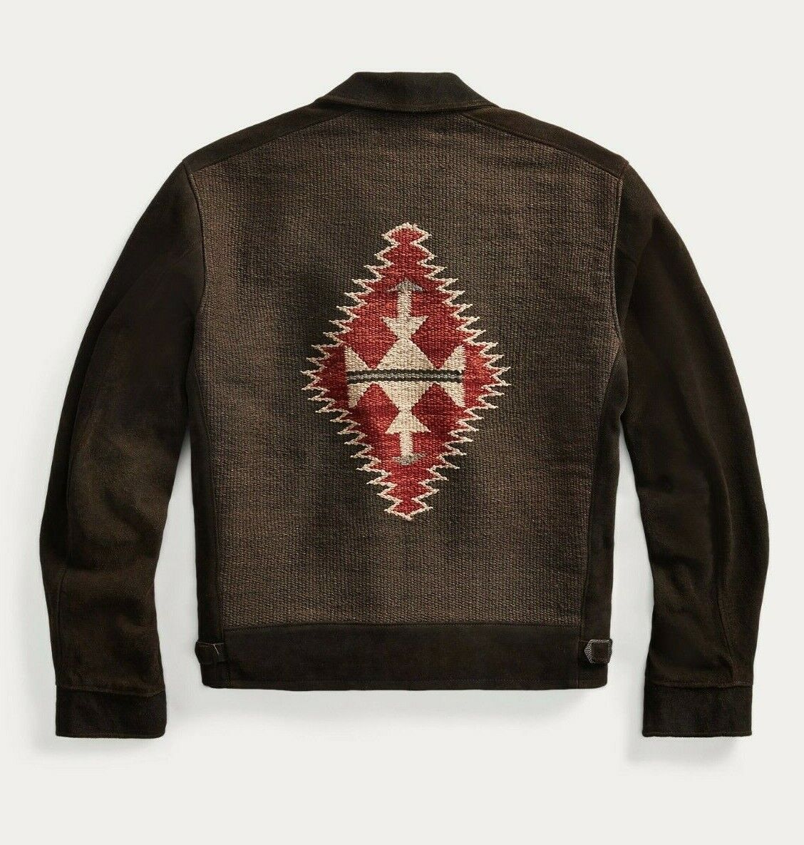 The Culver Suede Jacket from Double RL is inspired by hand-loomed blankets of the American Southwest and features a distinct red and cream hand-woven Chimayo pattern at the front and back panels. Finished with a beautiful vintage black tanned suede, the sleeves are fully lined with a cotton-blend fabric and the two front angled patch pockets with a moleskin lining to prevent crocking. Details include two adjustable buckled suede tabs, corozo buttons at the sleeve, and a custom zipper front closure. Western-inspired panels handwoven from a yarn-dyed cotton blend. Moleskin-lined front pockets. Full-zip front with a custom zipper. Corozo buttons at the cuffs.